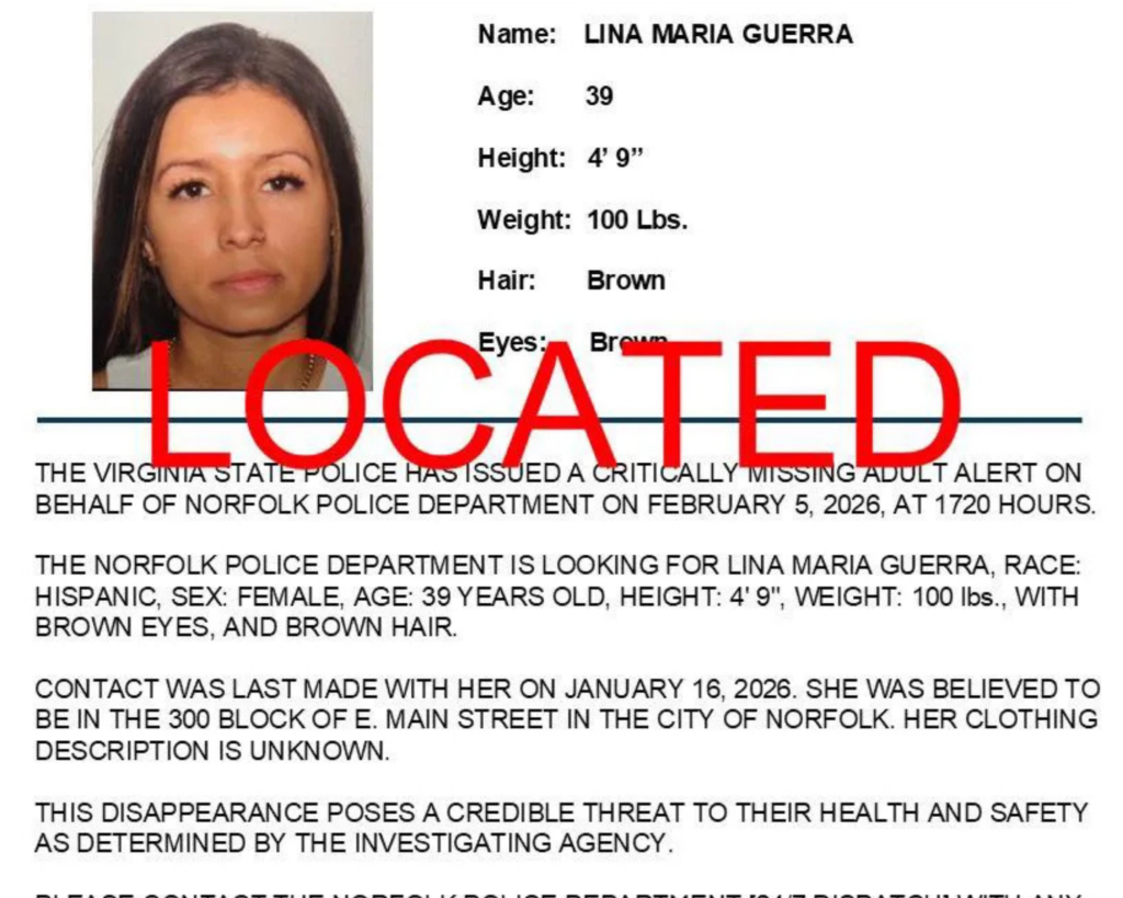 Lina Guerra was reported missing to Norfolk Police on February 4 after family members in Colombia lost contact with her. Relatives said they had not heard from her for about two weeks before reporting her missing, and they received misleading messages claiming she had been jailed for shoplifting.